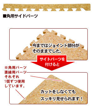 角用サイドパーツのサイズ(cm) ジョイント部分を含めた大きさ:約30x2.5 ジョイント部分を除いた大きさ:約30x1.5 ジョイント部分の幅:片側約1.0 コルク部分厚み:約0.1 EVA部分厚み:約0.7 素材 コルク カラー ナチュラル コルク原産国 ポルトガル コルクマット生産国 台湾 お手入れ方法 汚れた場合は、汚れたマットだけを取り外して、水で洗い流せます。