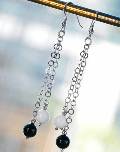 黒と白のオニックスが2粒下がったロングピアス 洗練されたデザインのチェーンはイタリアならでは・・・ 垢抜けファッションスタイルの主役を演じる洗練ピアス
